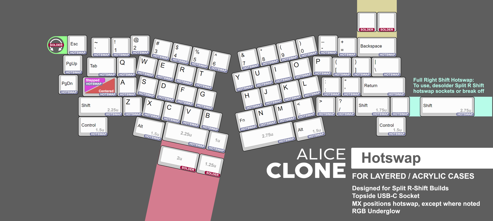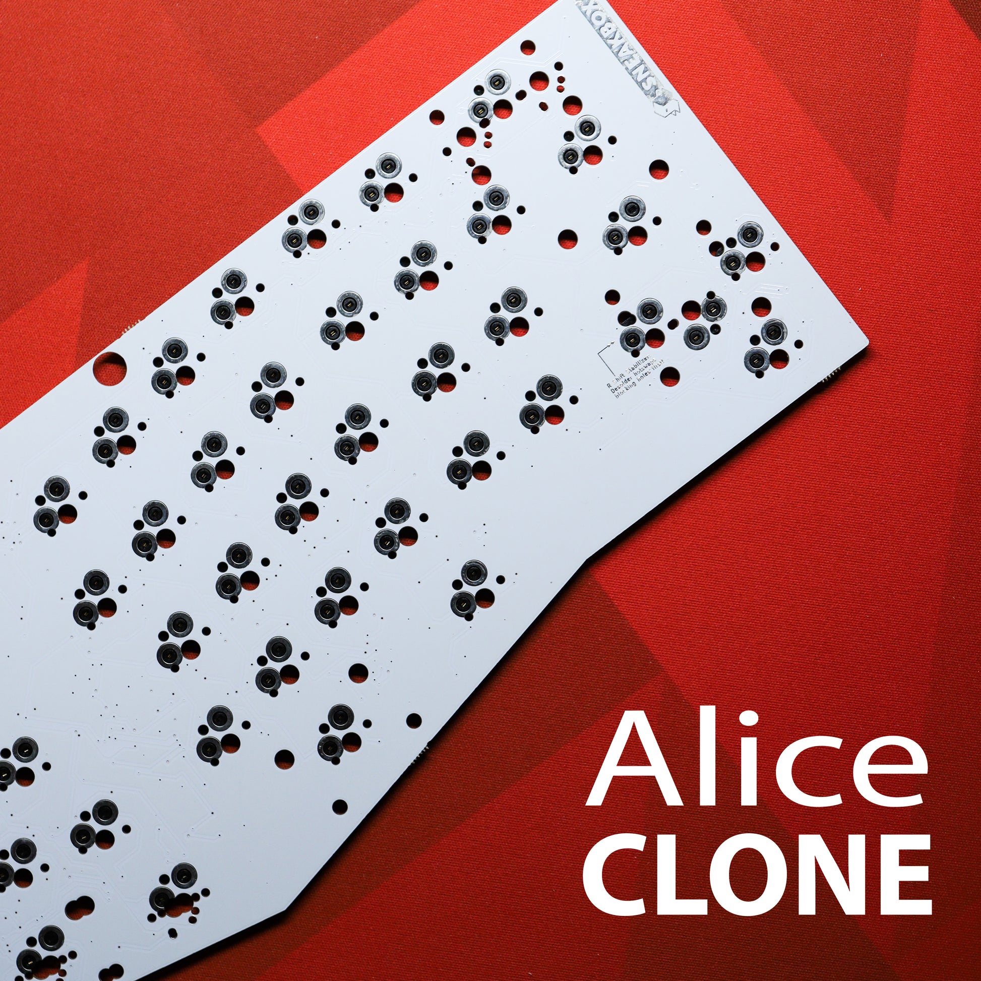 - Please be aware that some layered cases may not provide enough underneath clearance for the hotswap sockets, and thus the AliceClone PCB may not fit. Check with your desired casemaker.