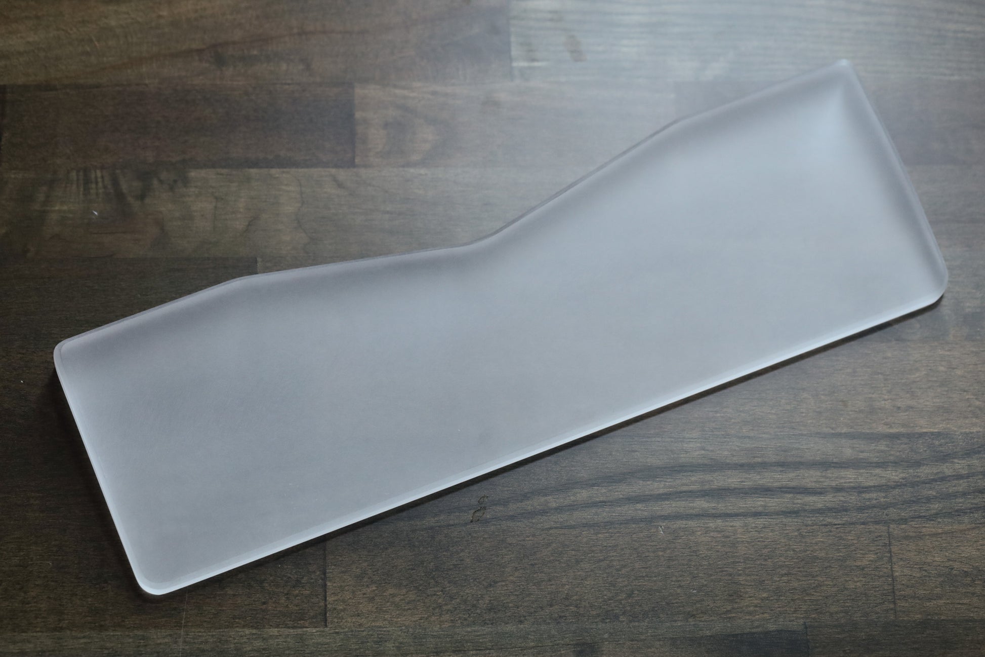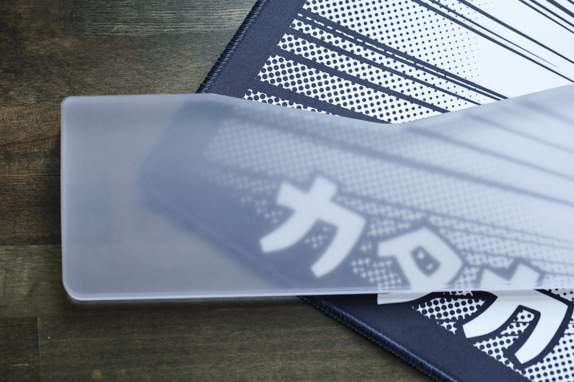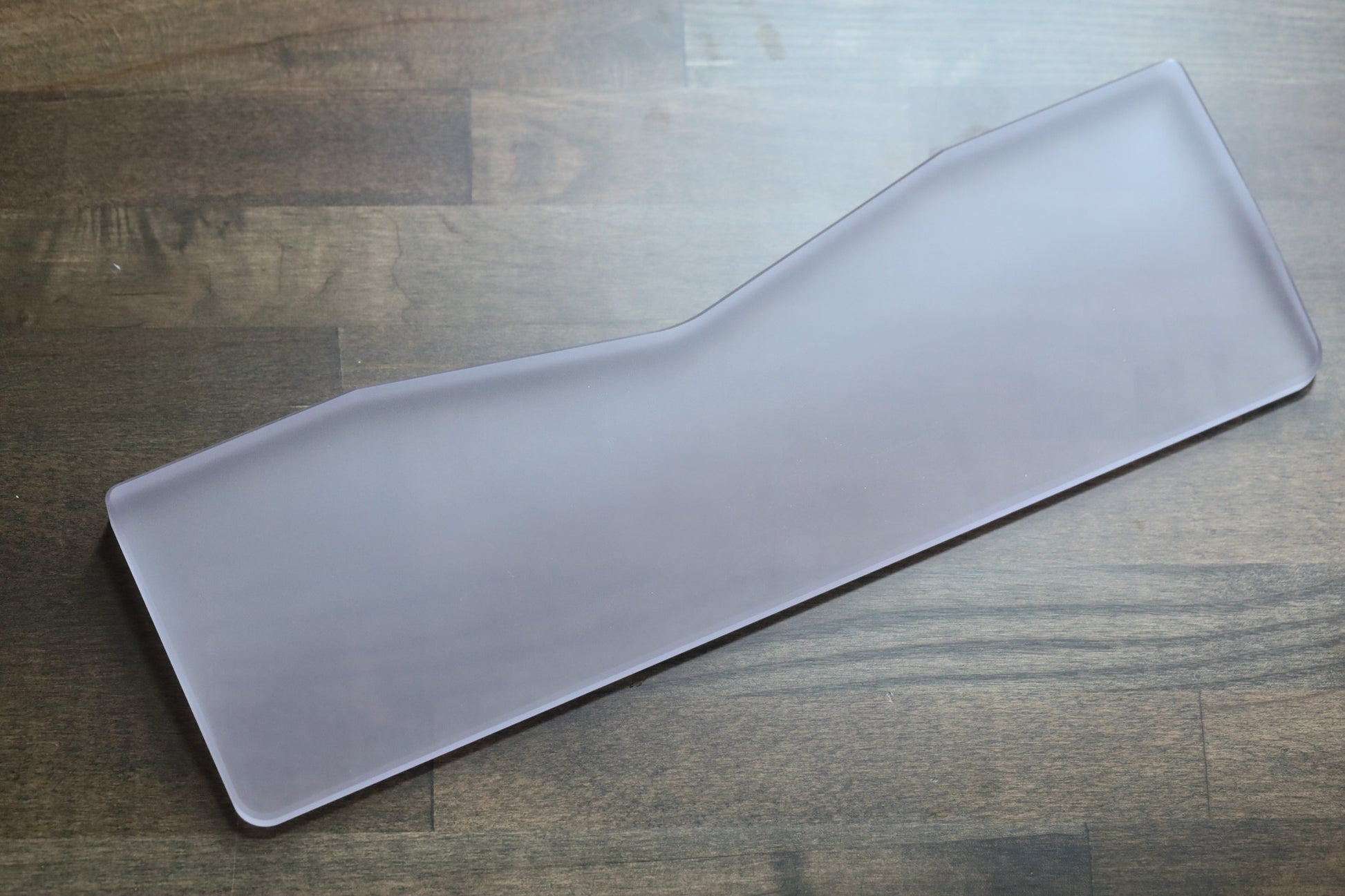 The translucent wrist rest options are designed to be as visually minimal as possible. Different from the wood wrist rests, these do NOT come with any feet or have any grooves on the undersurface. Acrylic wrist rests are CNC milled, then polished and subsequently sandblasted. Polycarbonate wrist rests are CNC milled, then sandblasted and finally frost varnish coated.